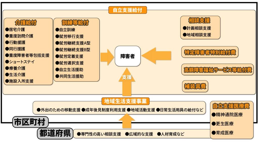 障害者総合支援法のサービスは、大きく二つに分けると、自立支援給付と地域生活支援事業にわけられます。どちらも市区町村または都道府県が実施主体となっていますが、位置付けには違いがあります。